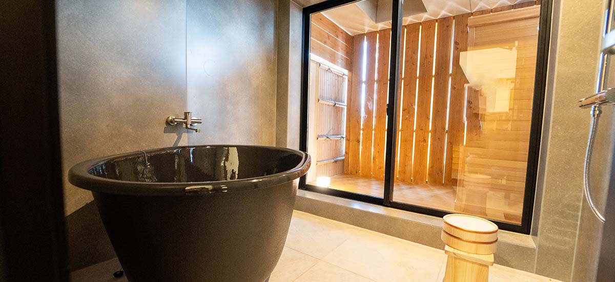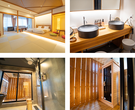 | 各客室設備 | テレビ、電話、インターネット接続(無線LAN形式)、お茶セット、冷蔵庫、個別空調、洗浄機付トイレ、シモンズ製マットレスのベッド・シャワーブース・露天風呂(温泉ではありません)、マッサージチェア、遠赤外線サウナ(1人用) |
