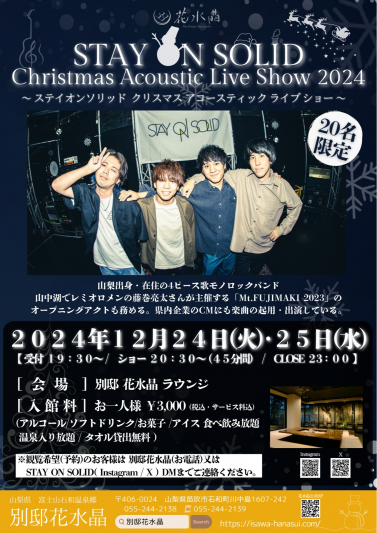 山梨県笛吹市の石和温泉郷にある旅館「別邸 花水晶」を運営する株式会社RQ石和リゾートでは、2024年12月24日(火)・25日(水)のクリスマス イブ・クリスマスの2日間の夜に、別邸 花水晶のロビーラウンジで地元山梨をメインに活躍する4ピース歌モノロックバンドによる、「STAY ON SOLID クリスマス アコースティック ライブ ショー2024」を題したライブイベントを開催することをお知らせいたします。温泉旅館のラウンジという特別な空間で彼らからのクリスマスの贈り物に浸かってみませんか。