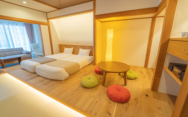 裸足で寛ぐことができる、和モダンの落ち着いた客室。